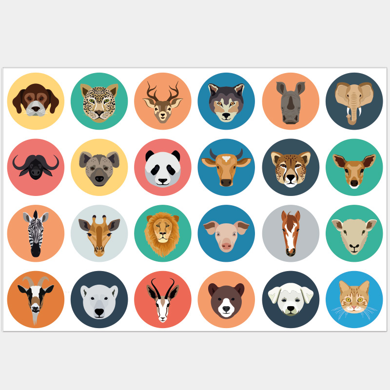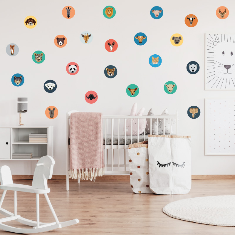 Wil jij de kinderkamer of babykamer eenvoudig opfleuren? Dan zijn deze schattige dierenkoppen een echte must-have. Deze set van 24 stickers bevat cirkels met verschillende kleuren en dieren, de cirkels hebben een diameter van 10cm. Dit materiaal is geschikt voor op alle vlakke ondergronden en ondergronden met een lichte structuur.
